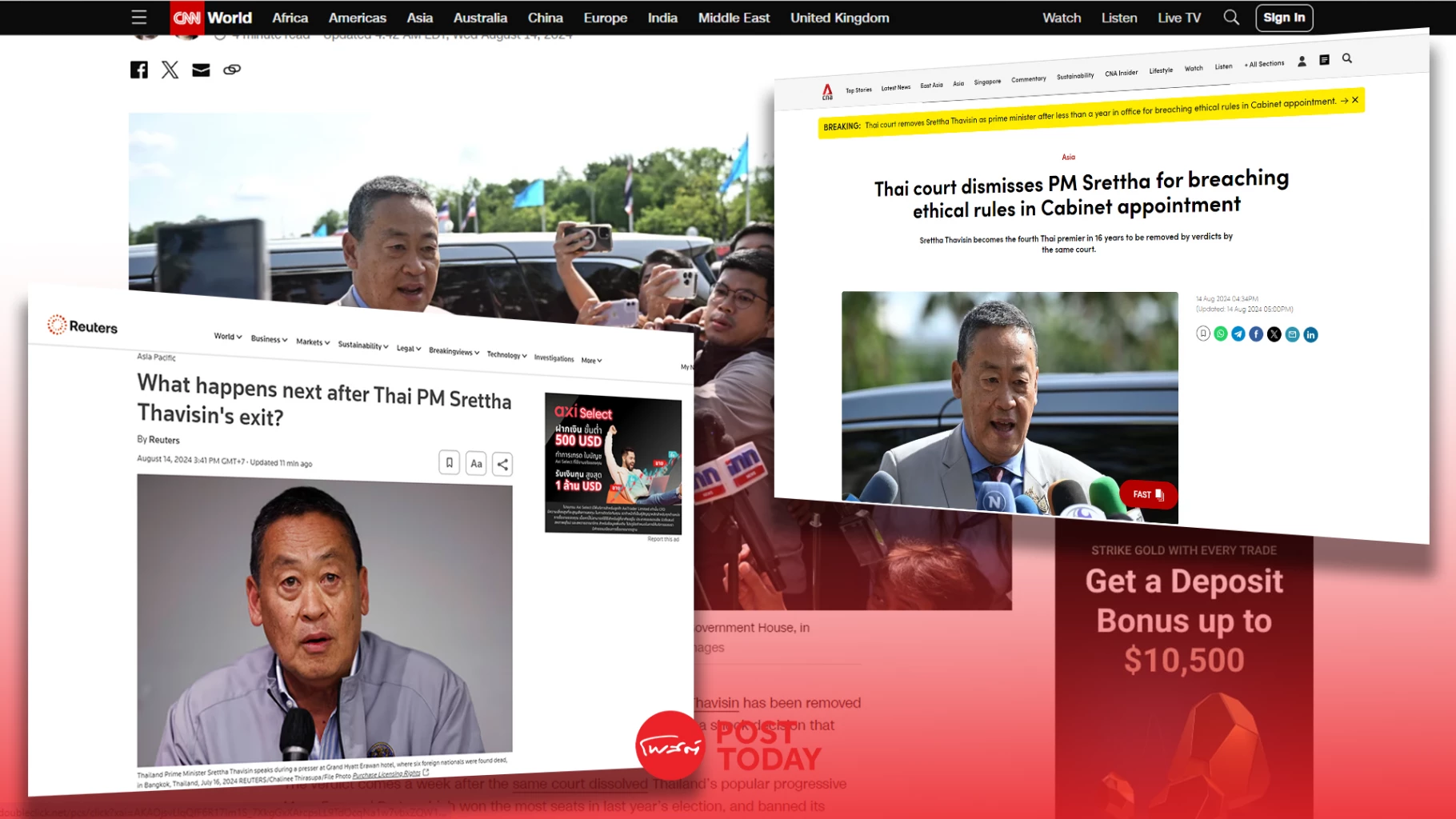 สื่อต่างประเทศเกาะติดศาลรัฐธรรมนูญอ่านคำพิพากษาถอดถอน เศรษฐา พ้นนายก ชี้ ทำให้การเมืองไทยอยู่ในภาวะไม่แน่นอน จับตาตั้งนายกใหม่