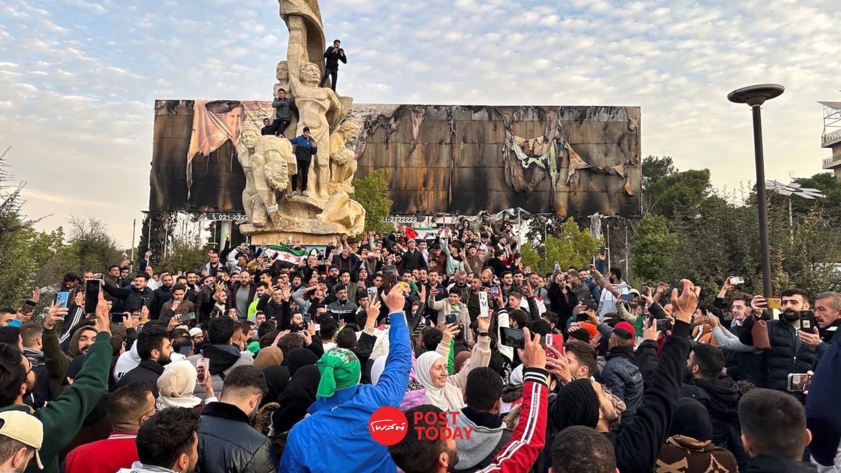ผู้คนหลายพันคนในรถยนต์และเดินเท้ารวมตัวกันที่จัตุรัสหลักในกรุงดามัสกัส โบกมือและตะโกนคำว่า "อิสรภาพ" จากการปกครองของตระกูลอัสซาดที่ปกครองมาครึ่งศตวรรษ