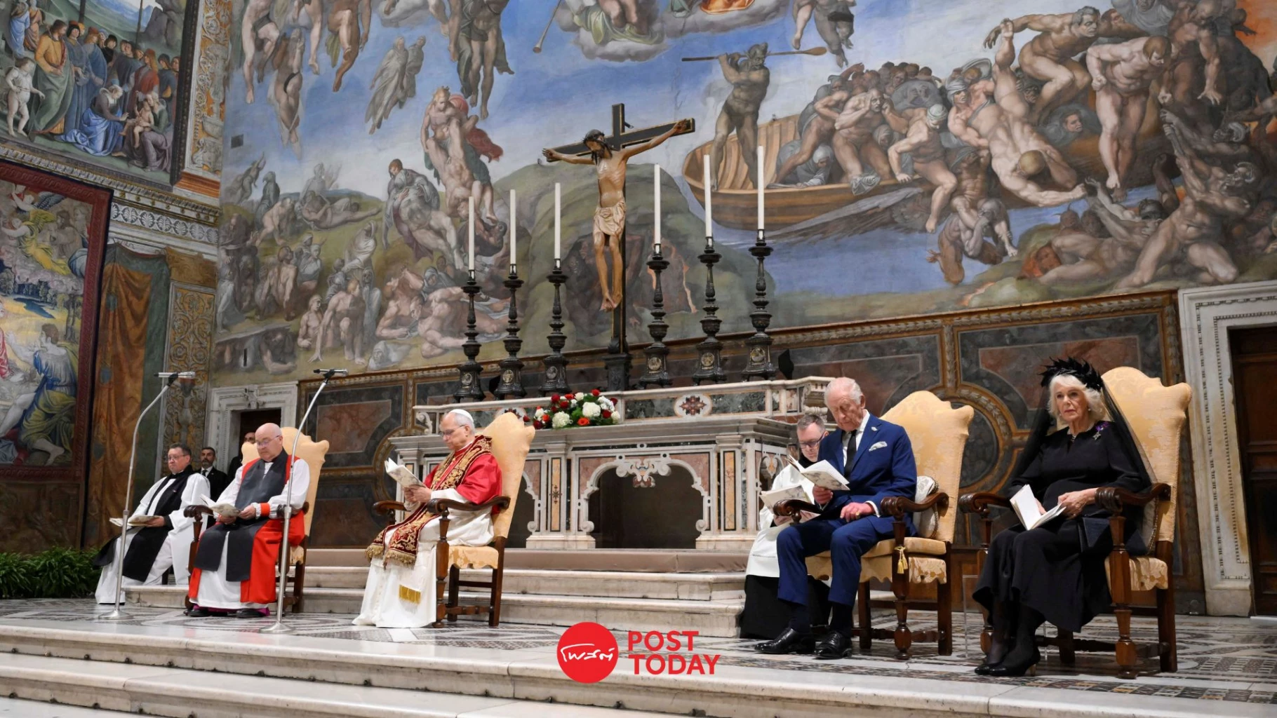 เสียงสวดภาษาลาตินและคำภาวนาภาษาอังกฤษดังสะท้อนก้องภายในโบสถ์ซิสทีน ซึ่งเป็นสถานที่ที่สมเด็จพระสันตะปาปาลีโอได้รับการเลือกตั้งเมื่อหกเดือนก่อนในฐานะสมเด็จพระสันตะปาปาชาวอเมริกันองค์แรก โดยมีภาพจิตรกรรมฝาผนังของไมเคิลแองเจโล “พิพากษาครั้งสุดท้าย” เป็นฉากหลังของพิธี