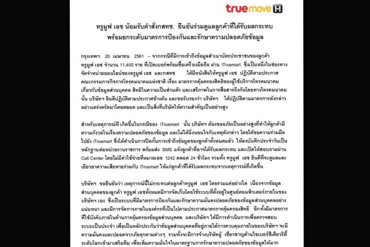 เมื่อวันที่ 20 เม.ย.  จากกรณีที่มีการเข้าถึงข้อมูลสำเนาบัตรประชาชนของลูกค้าทรูมูฟ เอช จำนวน 11,400 ราย ล่าสุดทรูมูฟ เอช ได้ออกหนังสื่อชี้แจง โดยมีเนื้อหาสรุปว่า จากกรณีดังกล่าว บริษัทฯ ยินดีปฏิบัติตามคำสั่ง กสทช.เรื่องมาตรการคุ้มครองสิทธิของผู้ใช้บริการ และขอรับรองว่าได้ปฏิบัติตามมาตรการดังกล่าวอย่างเคร่งครัดมาตลอด สำหรับเหตุการณ์ที่เกิดขึ้นตอนนี้ได้มีการขอความร่วมมือไปยัง iTruemart ให้ดำเนินการปิดกั้นการเข้าถึงข้อมูลของลูกค้าทั้งหมดแล้ว พร้อมให้ลงบันทึกประจำวันเป็นหลักฐานต่อหน่วยงานราชการ และส่งเอสเอ็มเอสแจ้งลูกค้าที่อาจได้รับผลกระทบ และเปิดให้สอบถามผ่านคอลเซ็นเตอร์โดยไม่มีค่าใช้จ่ายที่หมายเลข 1242 ตลอด 24 ชั่วโมง รวมทั้ง ทรูมูฟ เอช ยินดีดูแลและเยียวยาความเสียหายร่วมกับ iTruemart ให้แก่ลูกค้าที่ได้รับผลกระทบจากเหตุการณ์ที่เกิดขึ้น
