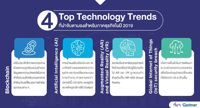 นอกจากนี้ จากการคาดการณ์ของการ์ตเนอร์ ระบุว่า เทคโนโลยีเทรนด์ที่น่าจับตามองและมีแนวโน้มที่จะส่งผลต่อภาคธุรกิจหลักๆ คือ บล็อกเชน,เอไอ, เออาร์, วีอาร์ และไอโอที
