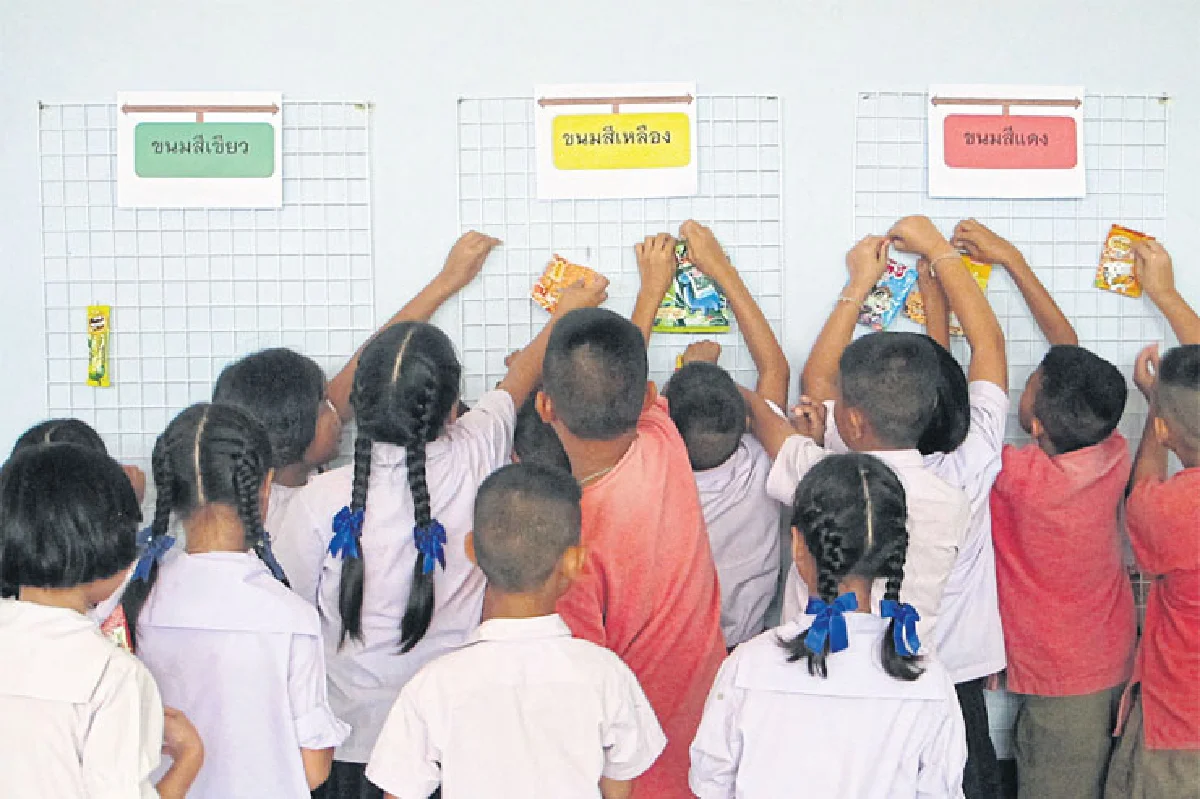 เมื่อเจอปัญหาว่ามีแต่ขนมร้องไห้ ก็เลยคิดว่าให้กินได้แต่อย่ากินบ่อย หรือกินแค่วันละครั้งก็พอ เราก็มาศึกษาเรื่องฉลากไฟจราจร โดยปรับเกณฑ์ตามแบบของเรา เพื่อคัดทำการคัดแยกขนมตามสัญญาณไฟจราจรคือ ขนมปลอดภัย “สีเขียว” ขนมปลอดภัยปานกลาง “สีเหลือง” และขนมอันตราย “สีแดง”
