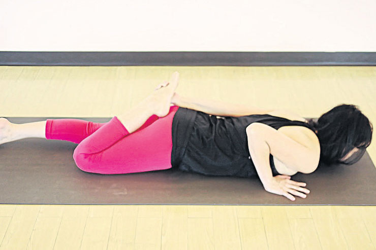 3.ตะแคงตัวไปด้านซ้าย พับขาซ้ายมาไว้ที่หน้าขาขวา ยกมือขวาไปจับหลังเท้าซ้าย