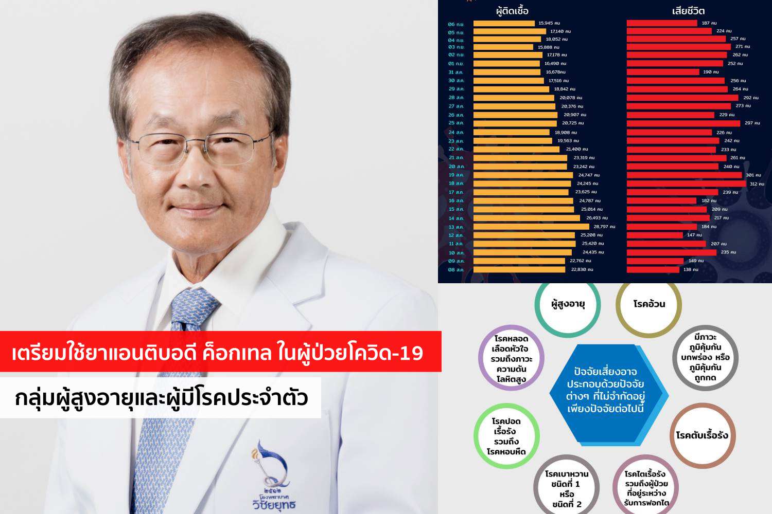นพ.มนูญ ลีเชวงวงศ์ เผยผู้สูงอายุและผู้มีโรคประจำตัวที่ป่วยโควิด-19 รีบรับการรักษาด่วนภายใน 7 วัน เตรียมใช้ยาแอนติบอดี ค็อกเทล ช่วยชีวิตผู้ป่วย เนื่องจากยอดผู้เสียชีวิตยังน่าห่วง