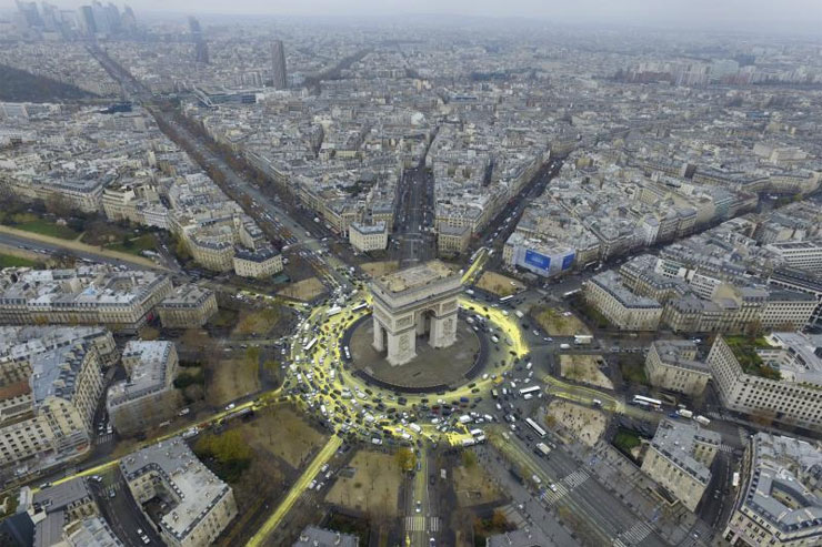 ระหว่างการประชุม COP21 นักเคลื่อนไหวจากกลุ่มกรีนพีซได้ทำให้เกิด “ดวงอาทิตย์ขึ้นที่ประตูชัย” ซึ่งเกิดที่แลนด์มาร์คของเมืองปารีส โดยมีสมาชิกบางคนโรยตัวลงมาจากประตูชัย และอีกหลายคนช่วยกันเทสีเหลือง (แบบล้างออกได้) ลงบนพื้นถนนรอบประตูชัย แล้วรถราที่วิ่งผ่านไปมาก็ช่วยกระจายสีเหลืองออกไป เมื่อมองจากมุมสูงเป็นภาพสีเหลืองคล้ายดวงอาทิตย์