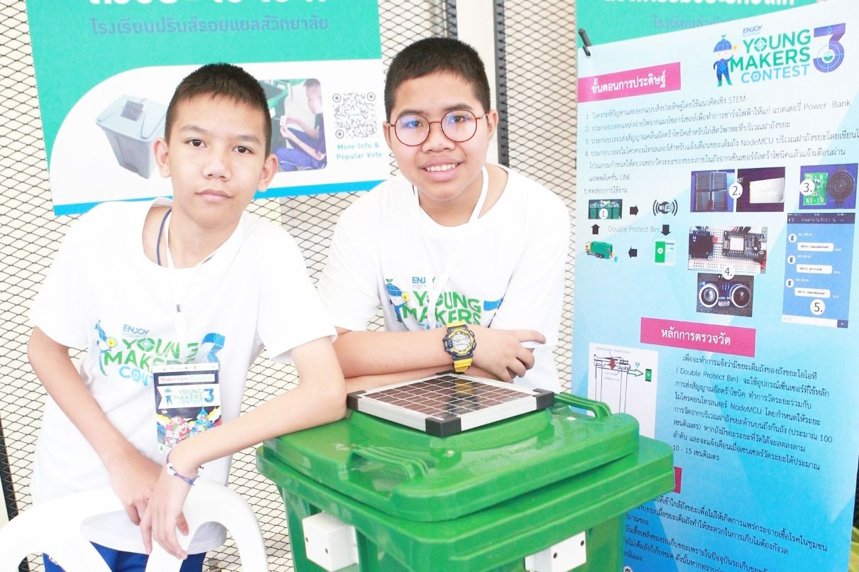 อีกเรื่องที่สำคัญ เวลาถังขยะเต็มแล้วไม่มีคนเอาไปทิ้ง บางครั้งคนที่ดูแลในการจัดเก็บขยะก็ไม่รู้ว่าถังขยะเต็ม บางคนแม้รู้ทั้งรู้ว่าถังขยะเต็มแล้ว ก็ยังเอาขยะไปทิ้งอีกจนขยะล้นออกมานอกถัง และกว่าเจ้าหน้าที่ผู้รับผิดชอบดูแลในการเก็บขยะจะมาเก็บขยะก็เกลื่อนพื้น เป็นภาพที่เห็นแล้วไม่น่าดู ยิ่งถ้าสถานที่นั้นเป็นโรงเรียน หรือหน่วยงานราชการ ก็ยิ่งไม่งามตาน่าดู” กรณ์กวิน และกนิษฐการจ์ สองเมกเกอร์รุ่นเยาว์เล่าถึงปัญหาที่เกิดกับถังขยะ
