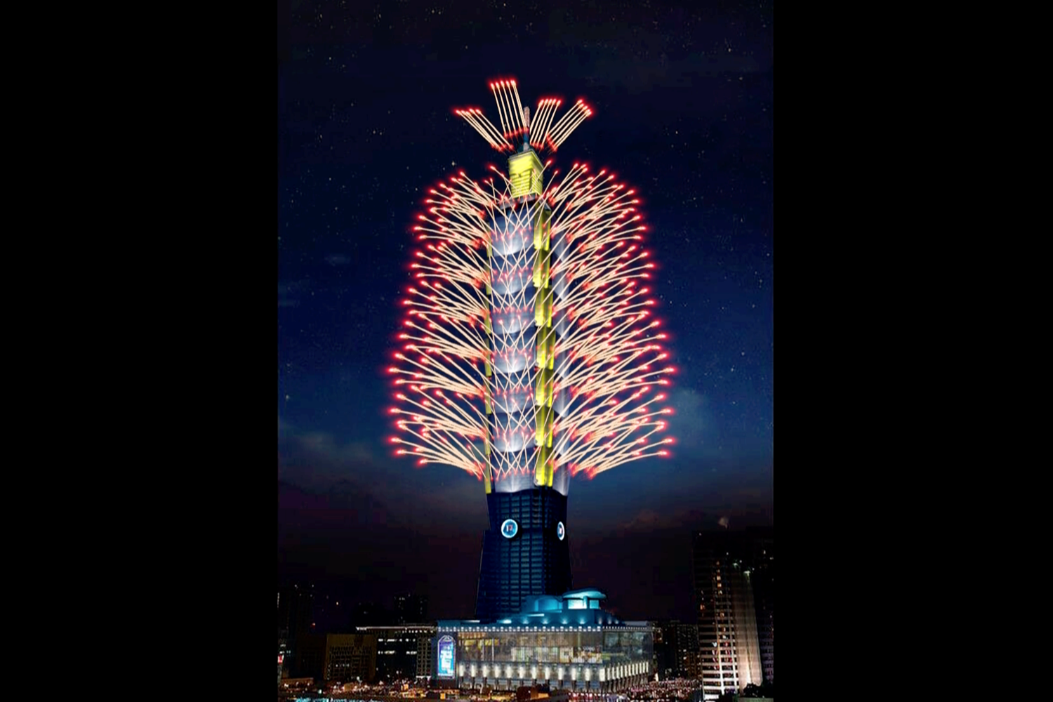 สำหรับพลุดอกไม้ไฟทรงวงกลมสามมิติ 360 องศาบนตัวอาคารสูงเป็นเทคนิคพิเศษที่จัดแสดงครั้งแรกในโลก พลุที่จัดแสดงมีจำนวน 16,000 ชุด ใช้เวลาทั้งหมด 300 วินาที ด้วยงบประมาณ 25 ล้านเหรียญไต้หวัน