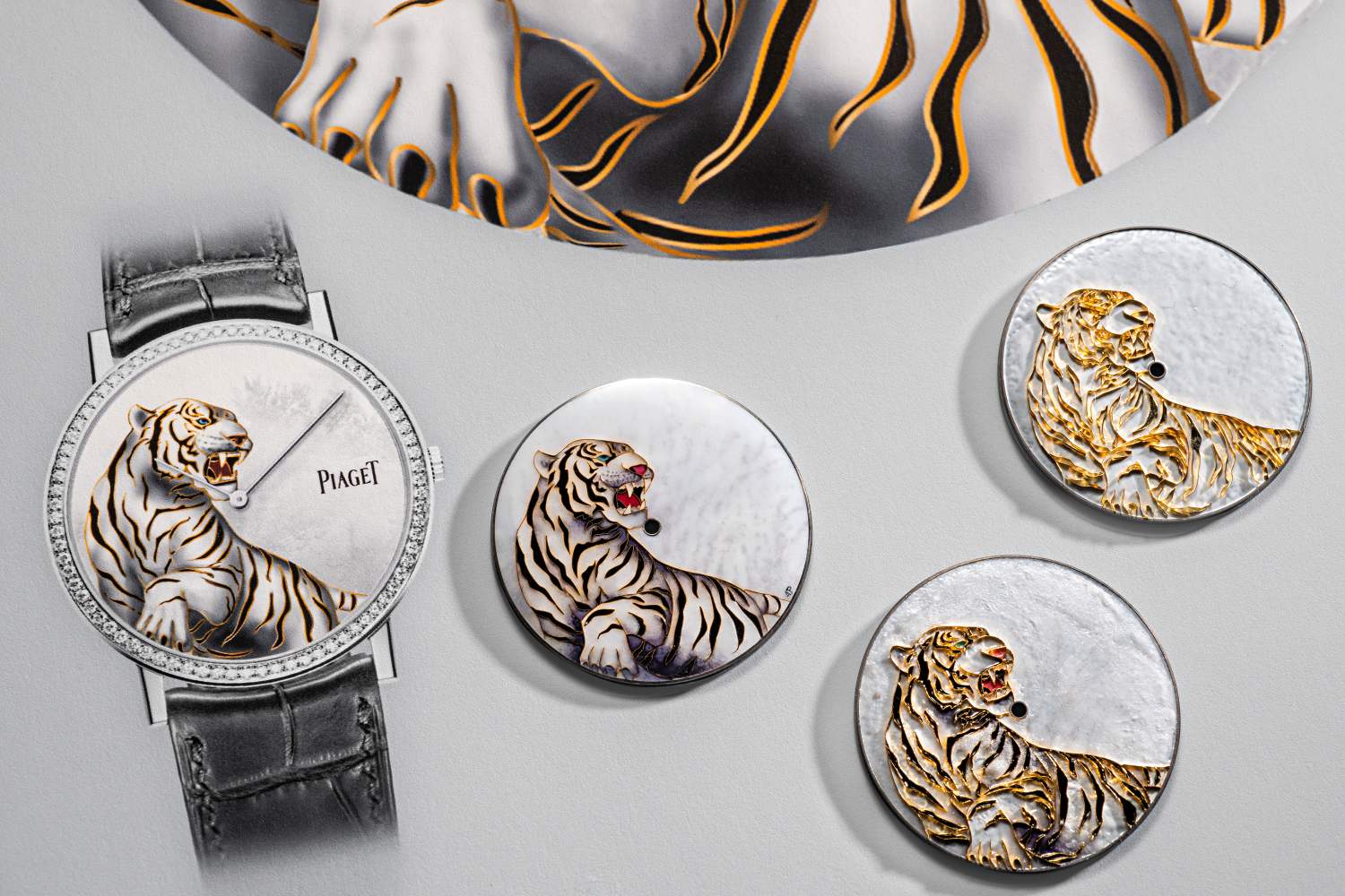 ปี 2022 นี้ เพียเจต์ (Piaget) ได้เผยโฉมผลงานลิมิเต็ด อิดิชั่นชิ้นใหม่ที่สะท้อนสัญลักษณ์รูปสัตว์ประจำปีอย่าง 'เสือ' ได้อย่างทรงพลัง ผ่านศิลปะการตกแต่งหน้าปัดด้วยเทคนิคการลงยาแบบคลัวซอนเน่ กรองด์เฟอ (Cloisonné Grand feu) โดยฝีมือปรมาจารย์ด้านอีนาเมลชื่อดังอย่าง แอนิตา พอร์เชต์ (Anita Porchet) ที่ร่วมงานกับเพียเจต์ (Piaget) มาตั้งแต่ปี 2006 ซึ่งขั้นตอนการสร้างสรรค์หน้าปัดนาฬิกานี้ เริ่มจากการสร้างพาร์ติชั่นขนาดจิ๋วด้วยเทคนิคเก่าแก่กว่า 4,000 ปีอย่าง คลัวซอนเน่ (Cloisonné) โดยนำริบบิ้นทองมาร้อยเรียงเป็นลวดลายตามแบบร่างที่สเก็ตช์ไว้อย่างประณีตบรรจง ก่อนลงยาในเฉดสีต่างๆ เพื่อสะท้อนองค์ประกอบของภาพให้ออกมาสมบูรณ์แบบและมีมิติที่สมจริง จากนั้นนำไปเผาในเตาด้วยความร้อนสูงที่อุณหภูมิ 820 - 850 องศาเซลเซียสอยู่หลายครั้งจนได้สีเรียบเนียนเสมอกัน ปิดท้ายด้วยการเคลือบเงาเพื่อมอบประกายแวววาวและช่วยให้ภาพคงทนถาวร
