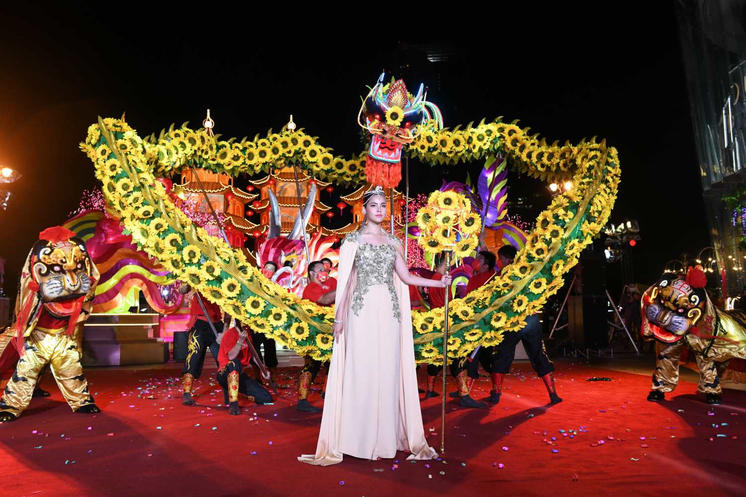 พร้อมด้วย “การแสดงเชิดมังกรทานตะวัน” ตัวแรกของประเทศไทย ที่ลำตัวของมังกรประดับดอกทานตะวันตลอดทั้งตัว โดยคนจีนเชื่อว่าดอกทานตะวันเป็นดอกไม้มงคลที่สื่อถึงความเจริญรุ่งเรือง ความโชคดี และเป็นสัญลักษณ์แห่งการมีชีวิตที่ยืนยาวเปี่ยมไปด้วยความสุข ส่วนมังกรจีนเป็นสัญลักษณ์โดดเด่นอันหนึ่งของจักรพรรดิและวัฒนธรรมจีน เชื่อว่ามีพลังอันยิ่งใหญ่ สง่างาม มีความอุดมสมบูรณ์ สติปัญญา และสิริมงคล การเชิดมังกรเชื่อว่าจะนำความโชคดีมาให้กับผู้คน ยิ่งเชิดมังกรระยะเวลานานมากเท่าไหร่ก็จะนำความโชคดีมาให้ชุมชนมากขึ้นเท่านั้น ในปีนี้ไอคอนสยามตั้งใจส่งตรงให้มังกรทานตะวัน นำพาความมั่งมี สุขขี มามอบให้กับทุกคน