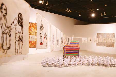 “ผมก็ยังให้ความสำคัญของผ้าอยู่นะ เพียงแต่ว่าผมพยายามจะทำให้มันเป็นมากกว่า 2 มิติ อย่างครั้งนี้ก็เป็นงาน 3 มิติ ที่เอาเทคนิคที่เรียบง่ายที่สุด เทคนิคแบบขวัญเรือนมาก ซึ่งป้าๆ ยายๆ ทำกัน คือการใช้เข็มกับด้ายนี่ละ มาต่อยอดให้เป็นแต่ละชิ้นงาน”