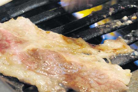 เริ่มต้นมื้ออร่อยแรกในร้าน “ยากินิกุ” (เนื้อย่าง) เสิร์ฟสไตล์บุฟเฟต์ มีของสารพัดที่ย่างไฟได้วางเรียงรายใส่ถาดให้เลือกมากมาย พิเศษคือเนื้อหมัก หมูหมักสูตรทางร้าน สีออกแดงปนส้ม แบบไม่หมักก็มี ใคร่เนื้อก็ตัก ใคร่หมูก็คีบ ปลาไข่ หมึกสด หมึกกรอบ ผักต่างๆ รวมทั้งของแนมกินเล่นก็แยะ ละลานตาไปหมด