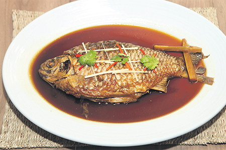 อีกหนึ่งเมนูบ้านๆ แต่อร่อยถึงใจคือ ปลาสลิดต้มใบมะขามอ่อน ปลาสลิดซึ่งเรียกว่าเป็น “ปลาเทวดา” อาจเพราะ มีรสวิเศษ ไม่คาว ไม่มีกลิ่นดิน ถูกนำมาทอด แล่เอาก้างออก ก่อนจะใส่ลงไปในน้ำแกงหางกะทิที่เคี่ยวด้วยข่า ตะไคร้ และหอมแดง ปรุงรสแล้วใส่ยอดมะพร้าวอ่อนลงไป เดือดแล้วเติมใบมะขามอ่อนให้รสเปรี้ยวและหอม โรยพริกขี้หนูสวนบุบ เมนูนี้อาจจะทำให้บางคนน้ำตาไหล ไม่ใช่เพราะเผ็ด แต่เพราะคิดถึงเมื่อครั้งที่เคยรับประทานกับที่บ้าน