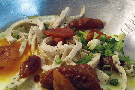 ไม่นานนักไข่กระทะแสนอร่อยก็มาเสิร์ฟอยู่ตรงหน้าไข่ 2 ฟองใหญ่ โรยหน้าด้วยหมูยอกุนเชียง มาพร้อมๆ กับขนมปังรอบนอกนุ่มใน ผ่ากลางยัดไส้ด้วยหมู ต้องรับประทานพร้อมกับกาแฟร้อนถึงจะเข้ากัน ส่วนไข่กระทะนั้นเหยาะพริกไทยป่นกับซอสตามแต่ใจชอบรับประทานให้เต็ม เพราะเราต้องใช้พลังงานทั้งวัน อาหารเช้าจึงเป็นเมนูสำคัญไม่ต่างกับเครื่องยนต์ที่ต้องการน้ำมันสตาร์ตตอนเช้าก่อนเริ่มงาน