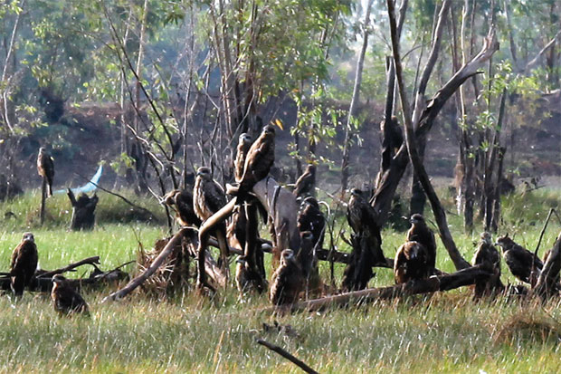 เมื่อพระอาทิตย์ขึ้นเหยี่ยวยังไม่ได้บินขึ้นฟ้าแบบนกอื่นๆ เสียเลยทีเดียว เพราะอากาศยังร้อนไม่พอสำหรับรองรับการบินของนกประเภทนี้ ดังนั้นหลังจากพระอาทิตย์ขึ้นจึงเป็นเวลาที่พวกมันบินจากยอดไม้ลงมาอยู่ตามเนินต่างๆ ในป่าละเมาะ ทั้งนี้เพื่อตากปีกและรออากาศอำนวย ช่วงนี้แหละที่ผมพอจะถ่ายรูปมันได้จากระยะไกล และนี่คือรูปภาพที่พอจะนำเอามาให้ดูได้ดูแล้วผมนึกถึงแร้งกินซากวัวที่อยู่ตามทุ่งตอนผมเป็นเด็กๆ เดี๋ยวนี้แร้งไทยสูญพันธุ์ไปแล้วที่หลงมาก็เป็นแร้งอินเดีย
