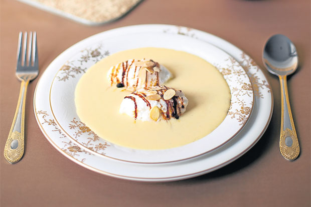 เวลาเสิร์ฟ ตักวานิลลาซอสลงในจาน เเล้วช้อนเมอเเรงค์ที่ได้วางลงบนวานิลลาซอส ราดด้วยน้ำตาลไหม้หรือคาราเมล โรยด้วยอัลมอนด์คั่วกรอบๆ
