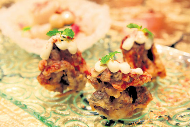 ออกสตาร์ตเบาๆ กับ เต้าหู้ทอดเผือก เป็นเมนูที่เชื่อว่ากินแล้วจะช่วยชำระความสกปรกให้ออกไปไกลๆ ตัว เริ่มจากใช้เต้าหู้รสนุ่ม แล้วท็อปด้านบนหน้าด้วยผักกาดแก้วยัดไส้ด้วยเห็ด แป๊ะก๊วย ปิโกนัท เอาไปนึ่ง โรยด้วยเผือกทอด เสิร์ฟมาพร้อมกับซุปผักที่ให้สัมผัสความนุ่มหวานและแก้เลี่ยนได้ดีทีเดียว จะว่าไปแล้วก็เหมือนกับการชะล้างสิ่งสกปรกออกไปนั่นเอง