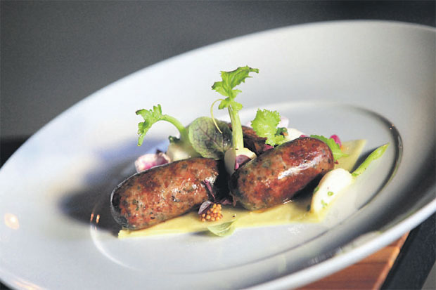 Mini Haggis จับแฮกกิสของชาวสกอตติชมาย่อส่วนให้มีไซส์เล็กๆ เท่าไส้กรอกอีสาน ผสมนานาเครื่องใน ตับ ปอด หัวใจของหมู รสสไปซีมากกว่าต้นตำรับ กินง่าย ไม่พะอืดพะอมเหมือนที่เคยไปลิ้มลองแฮกกิส ณ สกอตแลนด์ โอ้!!! อันนั้นไม่ไหว ใจจะขาดรอนกว่าจะหมดชิ้น แต่แฮกกิสคนไทยอร่อยถูกใจถูกลิ้น แกล้มดอกผักบุ้งกับเทอร์นิพดอง