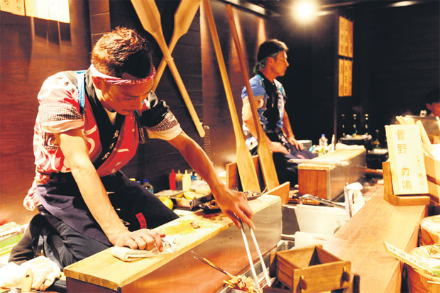 พอเชฟทำอาหารเสร็จก็จะเสิร์ฟด้วยไม้พายยักษ์ วางถ้วยชามจานอาหารบนไม้พาย แล้วยื่นให้ลูกค้า แปลกตาดี ไม่ค่อยเห็นร้านญี่ปุ่นทำแบบนี้ในเมืองไทย แต่ที่ญี่ปุ่น วัฒนธรรมยากิ หรือการปิ้งย่าง มีให้เห็นทั่วไป ยิ่งเฉพาะวัฒนธรรมเลือกไปส่งไปชมไปชิมไป คงเป็นเรื่องธรรมดาสามัญมากๆ