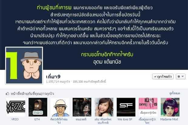 "โน๊ต อุดม" กล่าวขอโทษแฟนคลับผ่านทาง https://www.facebook.com/deaw9 ว่า