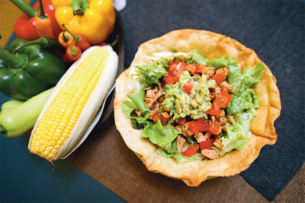 Tostada Ensalada ผักนานาชนิดคลุกรวมกัน โปะหน้าด้วยเนื้อสเต๊ก ไก่ ปลา หรือกุ้ง กับซัลซ่า กัวคาโมเล และน้ำสลัดสูตรพิเศษ เสิร์ฟในชามแป้งทาโก้
