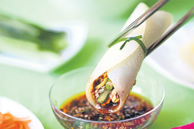 แผ่เเผ่นแป้งไว้บนจาน หยิบส่วนผสมใส่ตามชอบ ม้วน เเล้วจิ้มน้ำจิ้มที่อยู่ในถ้วยส่วนตัว