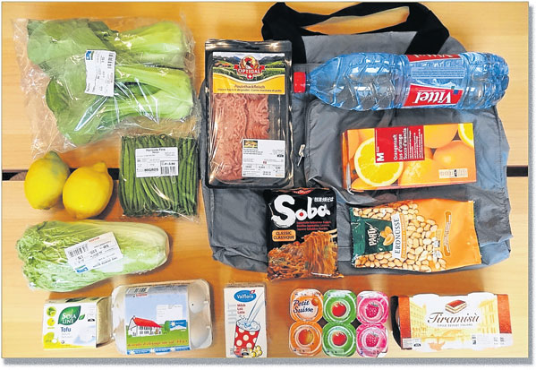 การเลือกซื้ออาหาร ถุง ผลิตภัณฑ์ : กระเป๋าพับได้ในรูปคือกระเป๋าที่ใช้จ่ายตลาดประจำ น้องๆ ในทีมที่เมืองไทยให้ก่อนมา มีประโยชน์มาก ขนาดกะทัดรัด พกง่าย กางออกมาขนาดใหญ่ ใส่ของได้มาก (จนลืมตัวว่าเดินถือของกลับบ้านเอง ไม่ได้ใช้รถเหมือนอยู่เมืองไทย ซื้อจนแบกหลังแอ่นทุกที) ปกติจะพับติดตัว แต่วันนี้จ่ายของที่ Migros จะเอาใส่บรรจุภัณฑ์คัดแยกที่บ้านไปทิ้ง