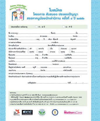 นิตยสาร Mother & Care ขอเชิญชวนน้องๆ หนูๆ ทั่วประเทศ ร่วม “อ่านเล่น เล่าสนุก ปลุกสมอง” กับการประกวดเล่านิทานสุดน่ารักแห่งปี ในโครงการ “ลับสมอง ประลองปัญญา สรรหาหนูน้อยนักเล่านิทาน ครั้งที่ 8” ชิงถ้วยรางวัลและทุนการศึกษา เปิดรับสมัครตั้งแต่วันนี้ถึง 31 ก.ค.นี้ โดยดาวน์โหลดใบสมัครและสมัครออนไลน์ที่ www.tkpark.or.th, www.motherandcare.in.th หรือสมัครผ่านโรงเรียน หน่วยงานที่ร่วมโครงการทั่วประเทศ หรือกรอกใบสมัครส่งแฟกซ์มาที่ 022413855 หรือที่ [email protected] หรือทางไปรษณีย์ที่ นิตยสาร Mother&Care อาคาร GM Group เลขที่ 914 ถนนพระราม 5 แขวงถนนนครไชยศรี เขตดุสิต กรุงเทพฯ 10300 สอบถามเพิ่มเติม โทร. 02-241-8000 ต่อ 327, 341 ติดตามข้อมูลและความเคลื่อนไหวได้ที่เว็บไซต์ทั้งสองเว็บ และที่ www.facebook.com/motherandcare