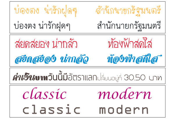 ความคลาสสิกปะทะความทันสมัย อักษรสีม่วงที่อ่อนช้อยบรรทัดบนเหมาะสมดีกับสไตล์คลาสสิก ขณะที่ถ้าเป็นความทันสมัย ตัวอักษรที่เรียบ เหลี่ยม สีเทา สื่อสารได้ตรงจุดกับคำว่า โมเดิร์น