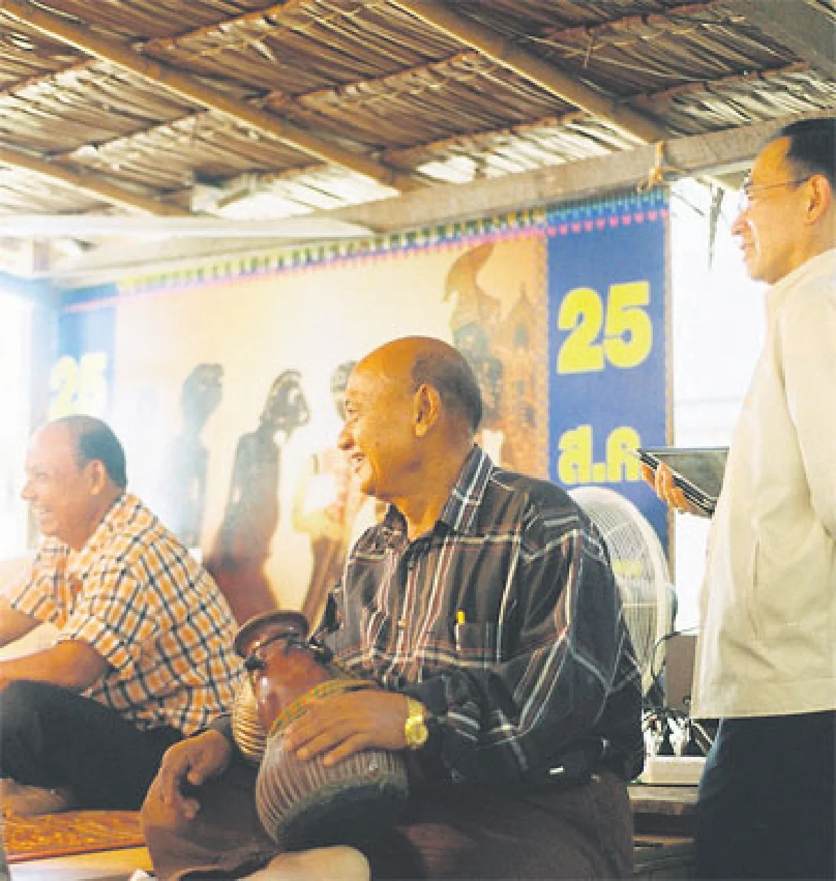 “...อย่างหนังเอียดนุ้ย ลูกศิษย์ผมก็ไปขยายมีลูกศิษย์เกือบ 20 กว่าคนแล้ว ผมสอนทุกคนว่า พวกนายทำได้ แล้วต้องสอนคนอื่นต่อนะ พูดถึงตอนนี้ พวกนายหนังตะลุงยังเต็มบ้านเต็มเมืองอยู่เหมือนเดิม เว้นแต่ว่าคนดูมันลดลงไปบ้าง ทีนี้กว่าจะดึงเด็กแต่ละกลุ่มมาอยู่ตรงนี้ เราก็ดึงยาก หนักใจเหมือนกัน แต่ถ้าเด็กหันมาเล่นหนังตะลุง มาเล่นมโนราห์แล้ว ร้านเกมมันไม่ไป ผมภูมิใจตรงนี้”