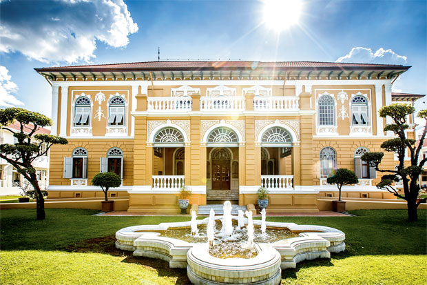 ก้าวแรกที่ย่างก้าวเข้าไป ก็ไม่ลืมจะยกกล้องขึ้นมาแชะภาพ พระตำหนักสีเหลืองสะดุดใจ ตัดกับท้องฟ้าสีสดและสนามหญ้าเขียวขจี ราวภาพดั่งจินตนาการ ตัวพระตำหนักสร้างด้วยรูปแบบตะวันตก คล้ายอาคารในยุโรปยุควิกตอเรีย และวิลล่าสไตล์อิตาเลียน ความงดงามนี้ขอยกความดีให้แก่นายช่างชาวอิตาเลียน “ยี. บรูโน” ที่รังสรรค์การออกแบบ พ.ศ. 2449 โดยเน้นส่วนโค้งกำแพงเหนือช่องเปิดในผนัง อีกทั้งยังมีการประกับกำแพงด้วยเสาหลอก รวมไปถึงการนำเทคนิคการเซาะร่องผนังปูนฉาบให้แลดูเป็นวัสดุก้อนชิ้นมหึมาและทำให้เกิดลวดลายด้วยเทคนนิคปูนปั้น นำมาซึ่งความตระการตายามพบเห็น