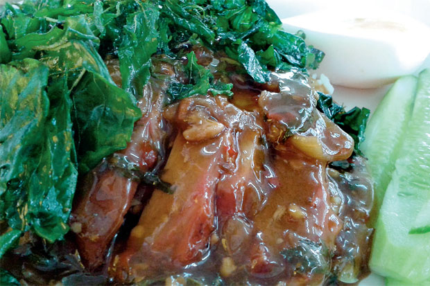 กลับมาดูที่พระเอกของเรากันต่อ กะเพรากรอบหอมกรุ่นโรยบนหน้าข้าวหมูแดงแซมหมูกรอบและไข่ต้มยางมะตูม ดูที่สีของน้ำราดแล้วจัดว่าใช้ได้ พอชิมแล้วรสชาติออกหวานมากไปหน่อย แต่พอรับประทานพร้อมๆ กับกะเพรากรอบ แล้วกลิ่นฉุนของกะเพราจะไปตัดลดทอนความหวานของน้ำราดหมูแดงให้อร่อยเป็นรสชาติอีกแบบที่ไม่คิดว่าจะเข้ากันได้