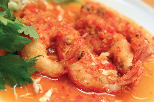 ถัดมา “กุ้งสะดุ้งไฟ” พี่ติ่งบอกว่าเน้นเลือกกุ้งไซส์ขนาดกลาง เพราะหากใหญ่ไปจะไม่ค่อยอร่อย ซึ่งวิธีทำจะเอากุ้งมาผ่าก่อนนำไปทอดโดยใช้ไฟแรงๆ แล้วยกขึ้นทันที จะทำให้เนื้อเหนียว ไม่สุก ไม่ดิบจนเกินไป นุ่มลิ้น ราดตามด้วยน้ำจิ้มซีฟู้ด เหมาะกับคนชื่นชอบอาหารทะเลเป็นชีวิตจิตใจ