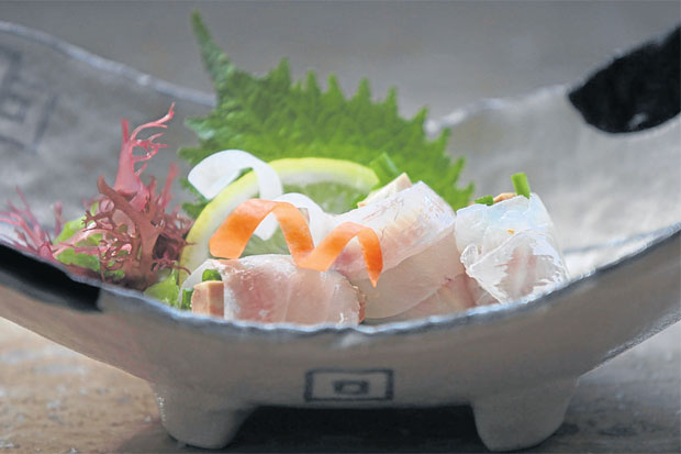 ตามมาด้วย Madai No Ankimo Maki Sashimi จานปลาดิบที่นำปลากะพงแดงญี่ปุ่นมาห่อม้วนตับปลาอังโกะไว้ด้านใน เชฟบอกว่า เนื่องจากเนื้อปลามังค์ฟิชไม่เหมาะกับการรับประทานแบบปลาดิบ จึงต้องใช้ปลาชนิดอื่นในการปรุงจานนี้ เนื้อหวานๆ ของปลากะพงแดงดิบ ผสานกับความมันของตับปลาอังโกะ ป้ายด้วยวาซาบิ จิ้มโชหยุรสเค็มๆ นิดหน่อย อร่อยกำลังเหมาะ