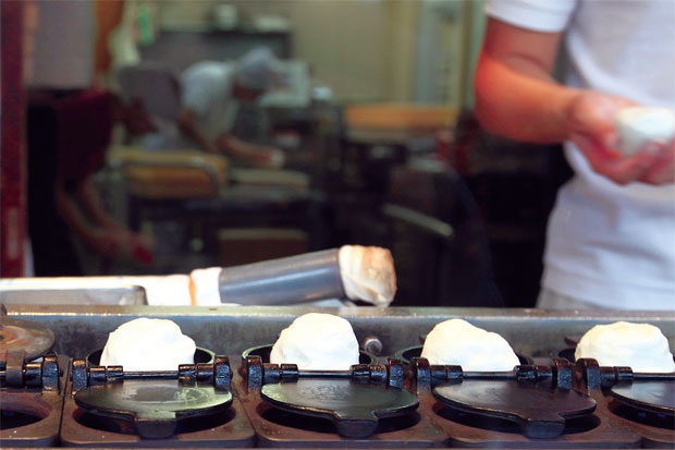 ถ้าสังเกตจะเห็นว่าหลายร้านมีเครื่องทำขนมอะไรบางอย่าง สิ่งนั้นคือ "ขนมอุเมกาเอะ โมจิ" ทำกันสดๆ ให้เห็นกันจะๆ เป็นแป้งเหนียวนุ่มสอดไส้มันหวาน เวลารับประทานต้องทานตอนยังร้อน ความหวานละมุนของมันด้านในและความเหนียวนุ่มของแป้งด้านนอกทำให้ลืมโมจิไดฟูกุ ที่เราคุ้นเคยไปเลย เดินต่อไปอีกเกือบถึงลานจอดรถบัสจะเจอร้านขาย “ปลาหมึกย่าง” ตายายเจ้าของร้านจะเชื้อชวนให้ชิมซึ่งแนะนำว่า ไม่ต้องเขิน ชิมไปเลยทั้งกำที่เขายื่นให้ แล้วจะรู้ว่าปลาหมึกไม่ใช่แค่เหนียว แต่ต้องนุ่ม ไม่เหม็นคาว และไม่จำเป็นต้องมีน้ำจิ้ม