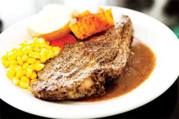 จานสุดท้ายคือ Pork Chop Steak (350 บาท) เนื้อหมูติดมันชิ้นโตเนื้อนุ่มราดด้วยเปปเปอร์ซอสสูตรเฉพาะ เสิร์ฟพร้อมขนมปังทาเนย มันฝรั่ง แครอทถั่นลันเตา และข้าวโพด