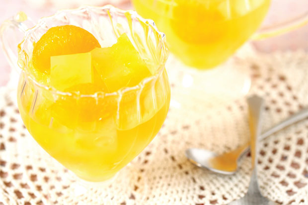 ใช้ส้อมบี้เนื้อส้มให้แหลก เติมลงในส่วนผสมวุ้นและเทใส่พิมพ์ พักให้เย็นตัวลง นำแช่เย็นประมาณ 4 ชั่วโมง