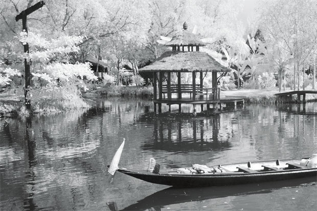 สาเหตุเพราะการถ่ายภาพด้วยเทคนิค Infrared มักจะประสบปัญหาเรื่องค่าความเข้มของแสงที่เหมาะสม การแปลงเป็นภาพขาวดำจะทำให้เห็นค่าความเข้มของแสงได้ดี เพราะโทนสีจากขาวไปสู่ดำ ถ้าหากถ่ายด้วยเทคนิคที่ถูกต้อง ค่ากลางสีเทา 18% ที่ถือเป็นมาตรฐานกลางของความเข้มของสี จะทำหน้าที่ได้ดีที่สุด ผมเลยใช้การแปลง File ภาพเป็นขาวดำ เพื่อเรียนรู้และตรวจสอบถึงเทคนิคการถ่ายภาพของตนเอง ซึ่งยอมรับกับท่านผู้อ่านตรงๆ นะครับว่า ยังคงต้องเรียนรู้อีกมากมาย กลับมาที่ภาพที่ผมนำเสนอในชุดนี้