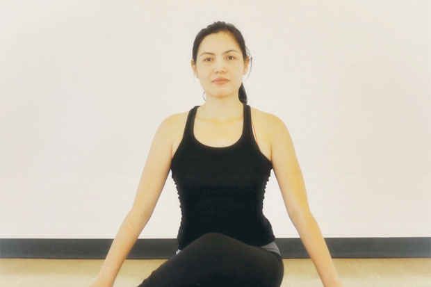 1.นั่งซ้อนขาซ้ายบนขาขวา ให้หัวเข่าบนล่างอยู่ตรงตำแหน่งเดียวกัน มือจับเท้าพับขาเข้ามาหาสะโพก หลังตรง