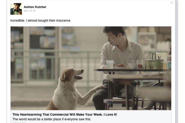แต่ล่าสุด โฆษณาชิ้นนี้ยิ่งดังขึ้นไปอีกเมื่อได้แม่เหล็กชั้นดีอย่าง “แอชตัน คุทเชอร์” ดาราดังฮอลลีวูด ถึงกับแชร์หนังโฆษณาชุดนี้ไปใส่ในหน้าเพจเฟซบุ๊กของเขาเมื่อวันที่ 14 เม.ย.ที่ผ่านมา โดยเขียนข้อความเจือด้วยอารมณ์ขันว่า “incredible. I almost bought their Insurance” “เหลือเชื่อ! ผมเกือบซื้อประกันของเขาเลยนะเนี่ย”