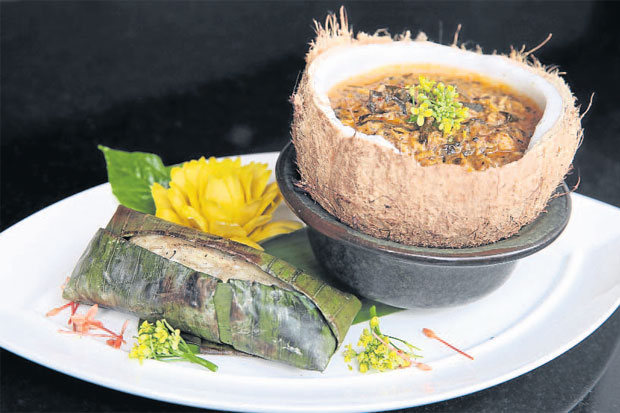 ที่ยกให้เป็นพระเอกของมื้อนี้คือ ปลากะพงย่างเสิร์ฟพร้อมซอสแกงดอกขี้เหล็ก เมนูนี้หารับประทานไม่ได้ง่ายๆ แถมคนที่ไม่ชอบอาหารรสขมก็อาจจะขอผ่าน แต่ถ้ารับประทานได้หรือรับประทานเป็นก็อาจจะถูกอกถูกใจกับแกงดอกขี้เหล็กรสจัดนี้เป็นพิเศษ รับประทานแนมกับปลากะพงห่อใบตองย่างหอมๆ นุ่มๆ ก็เข้ากันได้ดี