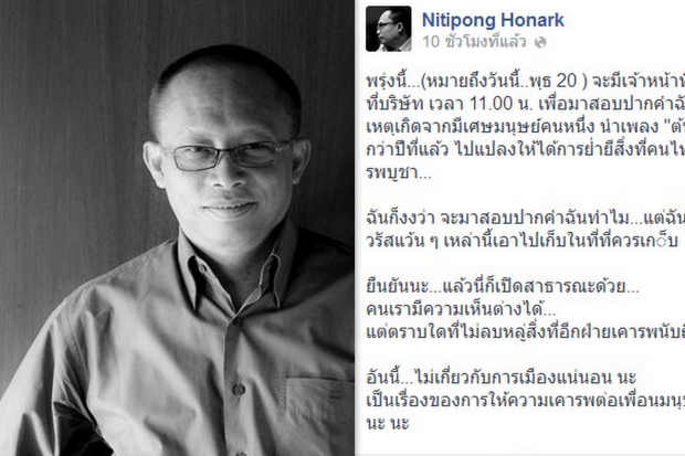 "พรุ่งนี้...(หมายถึงวันนี้..พุธ 20 ) จะมีเจ้าหน้าที่ตำรวจให้ความกรุณามาพบฉันที่บริษัท เวลา 11.00 น. เพื่อมาสอบปากคำฉัน...เหตุเกิดจากมีเศษมนุษย์คนหนึ่ง นำเพลง "ต้นไม้ของพ่อ" ที่ฉันแต่งเมื่อสิบกว่าปีที่แล้ว ไปแปลงให้ได้การย่ำยีสิ่งที่คนไทยส่วนใหญ่ของประเทศเขาเคารพบูชา...ฉันก็งงว่า จะมาสอบปากคำฉันทำไม...แต่ฉันโอเค...ถ้าเป็นส่วนหนึ่งที่กำจัดไวรัสแว้น ๆ เหล่านี้เอาไปเก็บในที่ที่ควรเก็บ ยืนยันนะ...แล้วนี่ก็เปิดสาธารณะด้วย...คนเรามีความเห็นต่างได้...แต่ตราบใดที่ไม่ลบหลู่สิ่งที่อีกฝ่ายเคารพนับถือ...มันจะไม่มีปัญหาอะไรมาก อันนี้...ไม่เกี่ยวกับการเมืองแน่นอน นะ เป็นเรื่องของการให้ความเคารพต่อเพื่อนมนุษย์ด้วยกัน..นะ นะ"