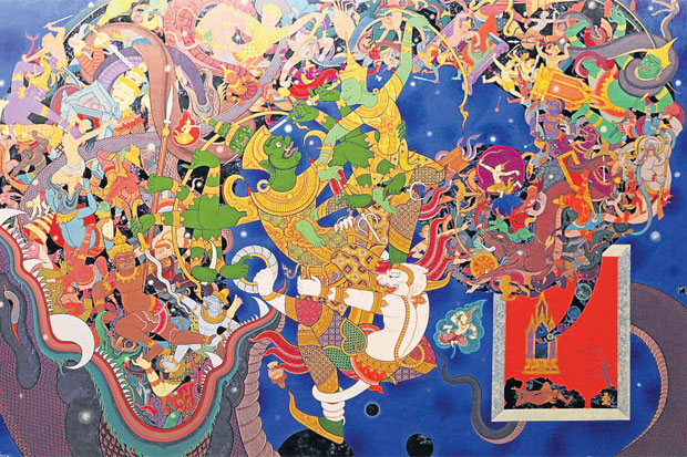 “นอกจากชุดเทพต่างๆ แล้ว ผลงานขนาดใหญ่ขึ้นมาหน่อยจะเป็นเทพรบกับมาร เพราะผมจินตนาการว่าในใจเรามีสองขั้ว จิตฝ่ายสูงและจิตฝ่ายต่ำคอยสู้รบกันตลอดเวลา ส่งผลให้เราทำดีหรือทำชั่ว ใช้เทพมารเป็นสัญลักษณ์การต่อสู้ในจิตใจของมนุษย์ แต่ผมชอบเขียนมารตัวใหญ่ๆ มีพละกำลังเยอะๆ ให้ดูเหมือนว่ามันมีอำนาจมากกว่า มีอิทธิพลกับมนุษย์มากกว่า แต่ถึงยังไงคนเราก็มีจิตฝ่ายดีอยู่ในตัวทุกคน ทุกคนจะมีธาตุพุทธะอยู่ในตัว อยู่ที่ว่าจะหลบซ่อนอยู่มุมไหน ชั่วขนาดไหนก็ยังมีสามัญสำนึกที่ดีอยู่ ทำชั่วเพราะโดนมารลวงมารหลอก แต่ถ้าเราใช้จิตฝ่ายดีต่อสู้จนชนะจิตฝ่ายชั่วได้ คือถ้าเราคิดดีทำดีก็จะมีเทพคอยปกป้อง คอยหนุน