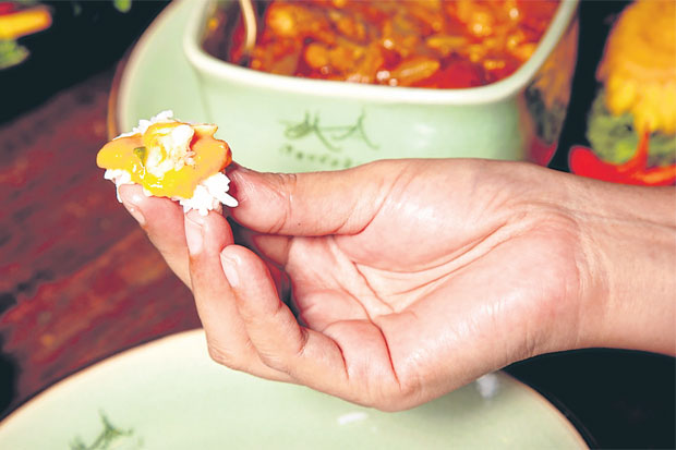 “ส้มตำหัวปลี” ที่ไม่ฉ่ำด้วยน้ำปรุง กินอร่อยด้วยการแกล้ม “ปีกไก่ยัดไส้” ควรเปิบด้วยข้าวเหนียวนึ่ง รับรองอร่อยสุดๆ “ไข่เค็มผัดพริกขิง” “ฉันชื่อบุษบา” เมนูยอดนิยม รวมดอกไม้ทอด “น้ำพริกปูไข่” แนมด้วยผักสดผักลวก เปิบแบบไทยๆ ต้องมีน้ำพริกเสมอ