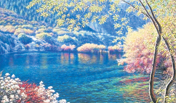 ศิลปินจาก จ.เชียงราย ยิ้มเมื่อพูดจบ ฟังน้ำเสียงดูมีความสุขเหลือเกิน ที่ได้ทำงานชิ้นนี้ขึ้นเป็นรูปเป็นร่างให้ผู้คนได้เห็นได้สัมผัสกับสิ่งที่เขาสื่อสารออกไป ซึ่งเป็นภาพวาดสีน้ำมันแนวอิมเพรสชั่นนิสม์ตามสไตล์ถนัด อันเป็นรูปวิวทิวทัศน์ของจิ่วจ้ายโกวที่สงบงาม เด่นด้วยสีสันอันเป็นเอกลักษณ์เฉพาะตัว และเทคนิคการวาดที่เชื่อมโยงไปกับการสงบนิ่งทำสมาธิก่อนลงฝีแปรง ทำให้ได้มุมมองภาพเสมือนได้ไปนั่งมองภูเขา ต้นไม้ และดอกหญ้าสั่นไหวไปตามแรงลมหนาวก็ไม่ปาน