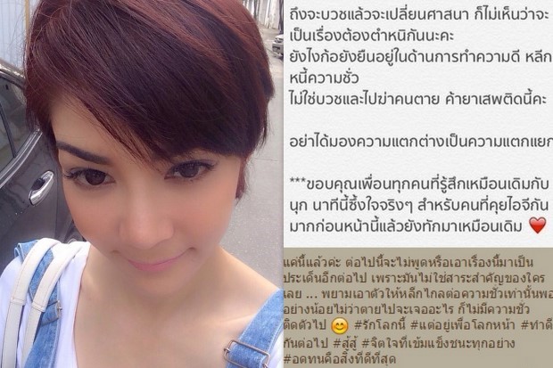 "ถึงจะบวชแล้วเปลี่ยนศาสนา ก็ไม่เห็นว่าจะเป็นเรื่องน่าตำหนิกันนะคะ ยังไงก็ยังยืนอยู่ในด้านการทำความดี หลีกหนีความชั่ว ไม่ใช้บวชแล้วไปฆ่าคนตาย ค้ายาเสพติดนี่คะ อย่าได้มองความแตกต่างเป็นความแตกแยก ขอบคุณทุกคนที่รู้สึกเหมือนเดิมกับนุ๊ก สำหรับคนที่คุยไอจีกันก่อนหน้านี้แล้วยังทักมาเหมือนเดิม"