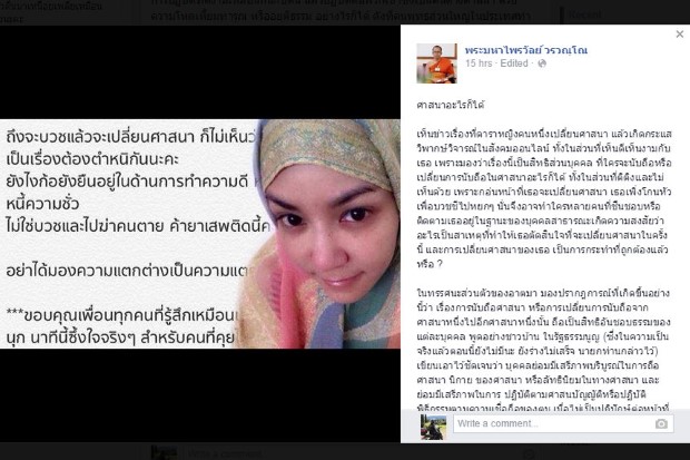 เห็นข่าวเรื่องที่ดาราหญิงคนหนึ่งเปลี่ยนศาสนา แล้วเกิดกระแสวิพากษ์วิจารณ์ในสังคมออนไลน์ ทั้งในส่วนที่เห็นดีเห็นงามกับเธอ เพราะมองว่าเรื่องนี้เป็นสิทธิส่วนบุคคล ที่ใครจะนับถือหรือเปลี่ยนการนับถือในศาสนาอะไรก็ได้ ทั้งในส่วนที่ติติงและไม่เห็นด้วย เพราะกอ่นหน้าที่เธอจะเปลี่ยนศาสนา เธอเพิ่งโกนหัวเพื่อบวชชีไปหยกๆ นั่นจึงอาจทำใครหลายคนที่ชื่นชอบหรือติดตามเธออยู่ในฐานะของบุคคลสาธารณะเกิดความสงสัยว่า อะไรเป็นสาเหตุที่ทำให้เธอตัดสินใจที่จะเปลี่ยนศาสนาในครั้งนี้ และการเปลี่ยนศาสนาของเธอ เป็นการกระทำที่ถูกต้องแล้วหรือ ?