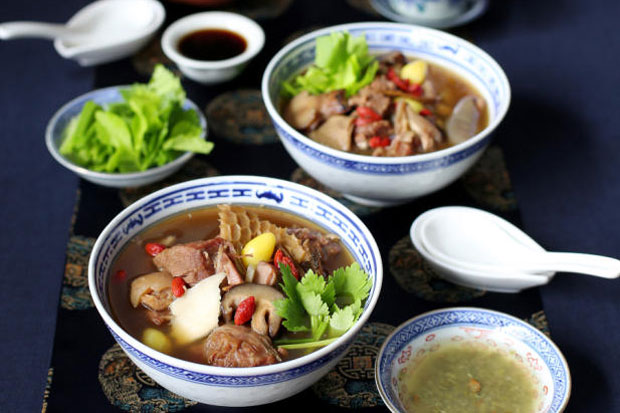 เมนูต่อมา แพะตุ๋นยาจีน เมนูนี้ต้องเป็นแพะหนุ่มๆ มันน้อยๆ จากนั้นนำมาตุ๋นเพื่อลดกลิ่นดับคาว วิธีการคือลวกเนื้อแพะติดกระดูกมาในน้ำเดือด แล้วนำไปเคี่ยวกับน้ำซุป ก่อนนำมาตุ๋น หรือจะผัดกับพวกขิง กระเทียม ต้นหอม เเล้วสาดด้วยเหล้าจีนให้หอมถึงชั้นสองของบ้าน