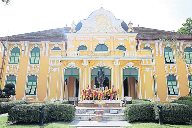 ตึกเจ้าพระยาอภัยภูเบศรสีเหลืองที่ปัจจุบันเป็นพิพิธภัณฑ์การแพทย์แผนไทย เป็นตึกที่ท่านเจ้าพระยาอภัยภูเบศร (ชุ่ม อภัยวงศ์) สร้างขึ้นเป็นที่ประทับของพระบาทสมเด็จพระจุลจอมเกล้าเจ้าอยู่หัว รัชกาลที่ 5 เมื่อเสด็จประพาสปราจีนบุรี แต่พระองค์ทรงสิ้นพระชนม์เสียก่อนจึงไม่ได้เสด็จฯ มาประทับ ต่อมาตึกจึงถูกใช้เป็นที่ประทับแรมของพระบาทสมเด็จพระมงกุฎเกล้าเจ้าอยู่หัว รัชกาลที่ 6 ส่วนท่านเจ้าพระยาฯ ไม่เคยใช้ตึกหลังนี้เป็นที่พำนักส่วนตัวเลยจนกระทั่งท่านถึงแก่อสัญกรรม มีเพียงร่างของท่านที่ถูกนำมาตั้งไว้บนชั้น 2 ของตึกหลังนี้ก่อนการพระราชทานเพลิงศพ