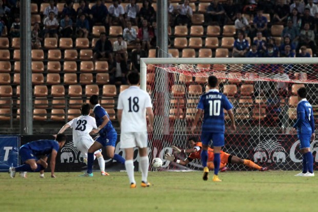 เริ่มเกม นาที 8 กองเชียร์ชาวไทยเฮลั่น เมื่อ ประกิต ดีพร้อม โยนบอลยาวออกด้านซ้ายให้ เกริกฤทธิ์ ทวีกาญจน์ ลากบอลเข้าเขตโทษ ก่อนปาดผ่านหน้า