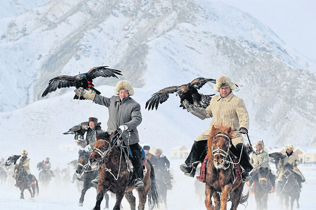 ภาพหาชมยากในยุคปัจจุบันสำหรับกีฬาลูกผู้ชายของชนเผ่าคีร์กีซที่นำเหยี่ยวเกาะแขนควบม้าไปแข่งขันล่าสัตว์ในความหนาวเหน็บกลางหิมะขาวโพลนในชนบทแถบ Akqi เขตปกครองตนเองซินเจียงอุยกูร์